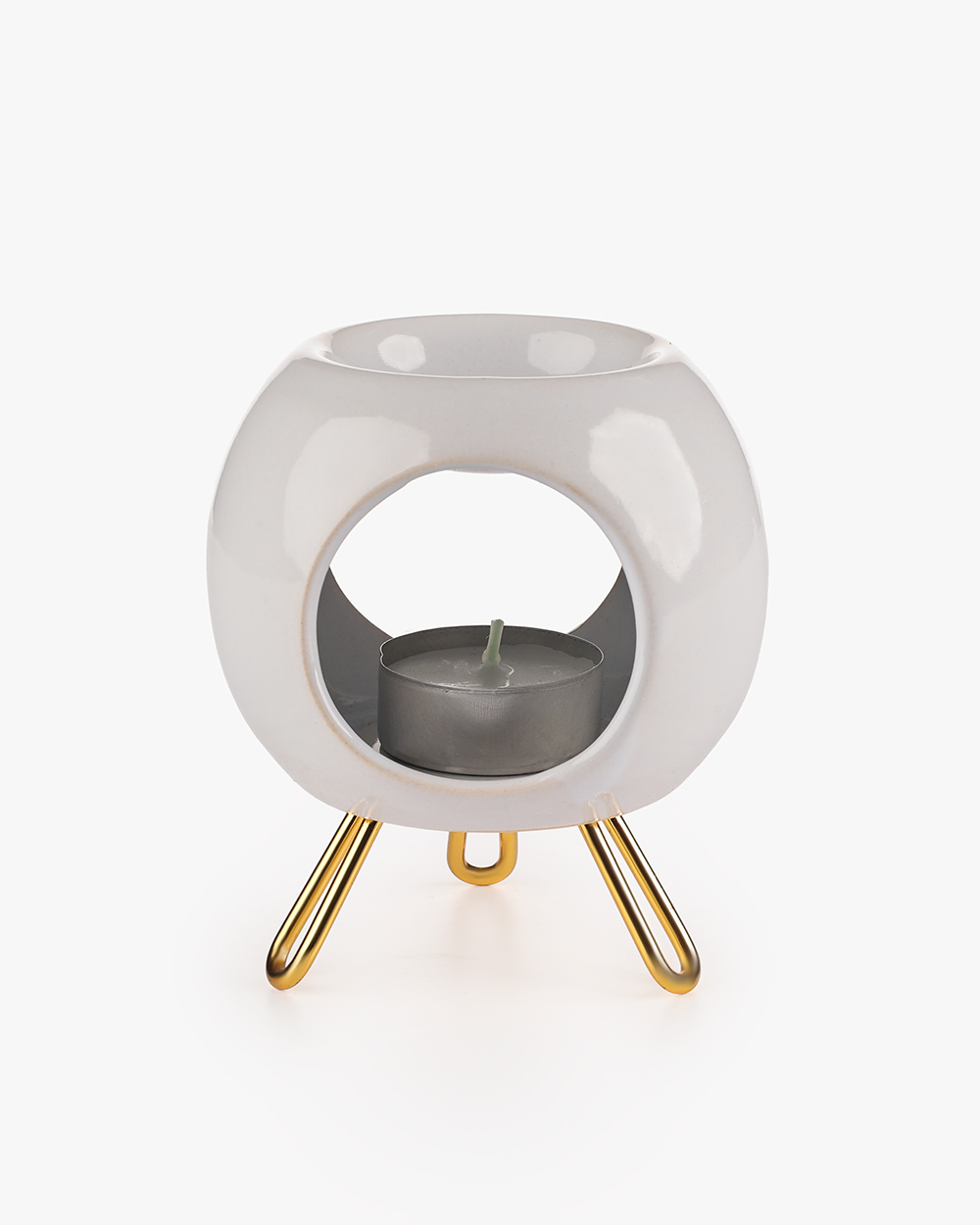 Διακοσμητικός κεραμικός αρωματιστής με κομψό, μοντέρνο design. Η σφαιρική του μορφή σε λευκό χρώμα με χρυσά μεταλλικά πόδια τον καθιστά ιδανικό διακοσμητικό στοιχείο για κάθε χώρο, ενώ η πρακτική του κατασκευή επιτρέπει την εύκολη χρήση με τα Waxmelts μας.Η διαχρονική σχεδίασή του ταιριάζει σε κάθε στυλ διακόσμησης, καθώς συνδυάζει τη φυσικότητα με την κομψότητα, δημιουργώντας ένα αντικείμενο που δεν είναι μόνο λειτουργικό αλλά και διακοσμητικό.