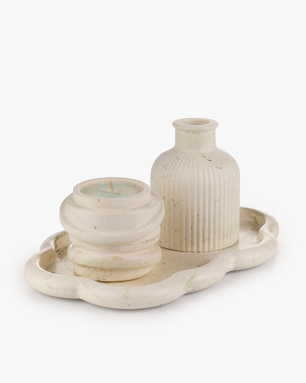Το σετ περιλαμβάνει έναν πορσελάνινο δίσκο, ένα κερί σε χειροποίητο δοχείο και ένα πορσελάνινο βάζο με ραβδωτή υφή, δημιουργώντας μια διακριτική αλλά εντυπωσιακή σύνθεση.
